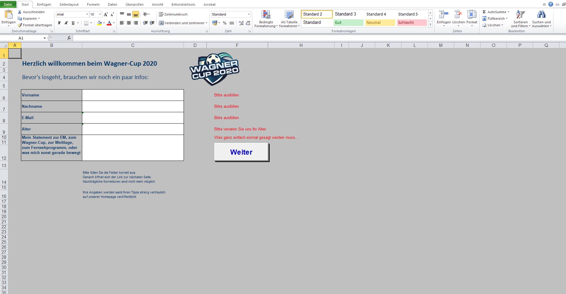 Seite 2: Kontaktdaten ausfüllen und ein Statement abgeben. Das Statement könnt ihr frei wählen, optimalerweise hat es natürlich mit der EM, dem Wagner Cup, eurem Tipp oder Fussball im Allgemeinen zu tun. Wenn alle Felder ausgefüllt sind erscheint ein "Weiter" Button: