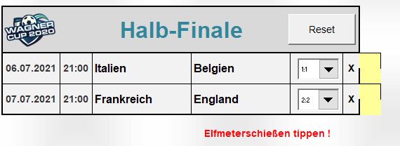 Es ist für jedes Spiel das Ergebnis nach 90 bzw. 120 Minuten zu tippen. Erfordert der/die abgegebene(n) Tipp(s) ein Elfmeter-Schießen, erfolgt die Aufforderung zur Abgabe eines Zusatz-Tipps, welche der beiden Mannschaften das Elfmeter-Schießen gewinnt. Dieser Tipp ist durch Eingabe von 1 (für Mannschaft 1) oder 2 (für Mannschaft 2) im entsprechenden Feld abzugeben.