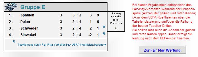 Da 24 Mannschaften (in 6 Gruppen) teilnehmen, steigen die 4 besten Gruppendritten ebenfalls ins Achtelfinale auf. Die UEFA hat sich hierfür einen besonders komplizierten Modus (Offiziellen Regularien) überlegt, der Gerhard bei der Programmierung des Tippformulars besonders viel Zeit und Aufwand gekostet hat: Es spielt nämlich auch das Fair Play Verhalten(!) der einzelnen Teams eine (untergeordnete) Rolle bei der Bestimmung der besten Gruppendritten! Bei Punktgleichheit zweier oder mehrerer Mannschaften entscheiden folgende Kriterien in dieser Reihenfolge:
